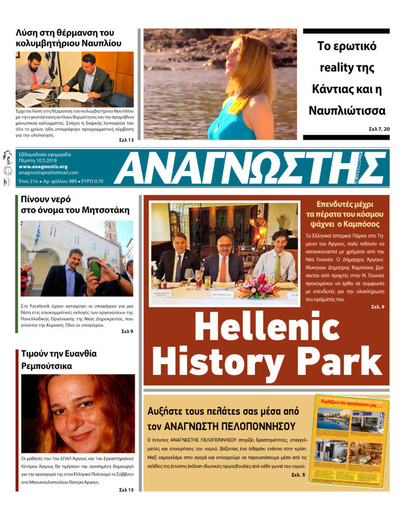 To Τεύχος 989 της εβδομαδιαίας εφημερίδας Αναγνώστης Πελοποννήσου με έδρα το Ναύπλιο του Νομού Αργολίδας που εκδόθηκε και κυκλοφόρησε την Πέμπτη 10 Μαΐου 2018