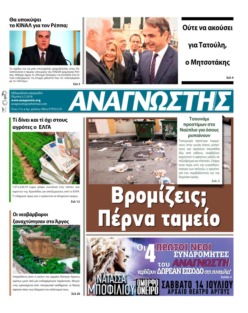 To Τεύχος 996 της εβδομαδιαίας εφημερίδας Αναγνώστης Πελοποννήσου με έδρα το Ναύπλιο του Νομού Αργολίδας που εκδόθηκε και κυκλοφόρησε την Πέμπτη 5 Ιουλίου 2018