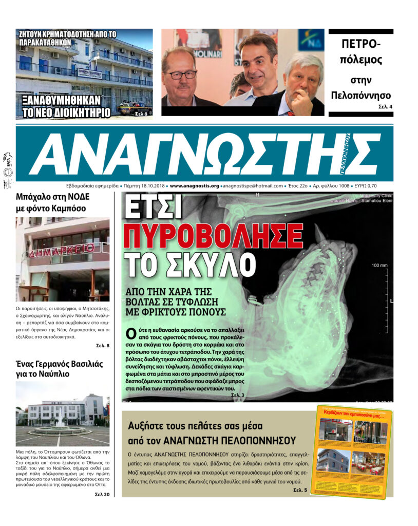 To Τεύχος 1008 της εβδομαδιαίας εφημερίδας Αναγνώστης Πελοποννήσου με έδρα το Ναύπλιο του Νομού Αργολίδας που εκδόθηκε και κυκλοφόρησε την Πέμπτη 18 Οκτωβρίου 2018