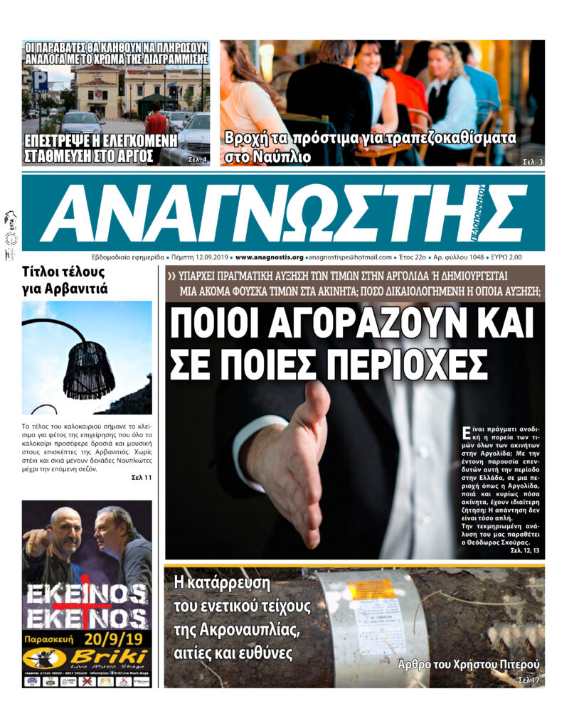 To Τεύχος 1048 της εβδομαδιαίας εφημερίδας Αναγνώστης Πελοποννήσου με έδρα το Ναύπλιο του Νομού Αργολίδας που εκδόθηκε και κυκλοφόρησε την Πέμπτη 12 Σεπτεμβρίου 2019