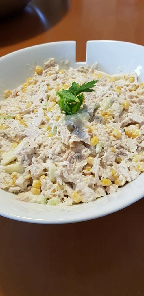 Προσθέτουμε τα υλικά μας – το καλαμπόκι, το σέλερι και το ξινόμηλο ψιλοκομμένα, αλάτι, πιπέρι, και , τέλος, την μαγιονέζα.