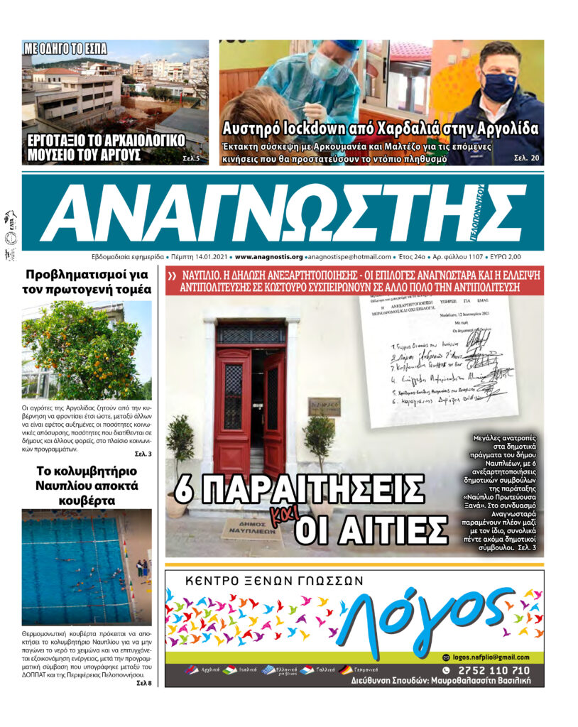 To Τεύχος 1107 της εβδομαδιαίας εφημερίδας Αναγνώστης Πελοποννήσου με έδρα το Ναύπλιο του Νομού Αργολίδας που εκδόθηκε και κυκλοφόρησε την Πέμπτη 14 Ιανουαρίου 2021