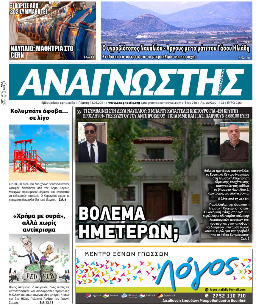 To Τεύχος 1123 της εβδομαδιαίας εφημερίδας Αναγνώστης Πελοποννήσου με έδρα το Ναύπλιο του Νομού Αργολίδας που εκδόθηκε και κυκλοφόρησε την Πέμπτη 13 Μάϊου 2021