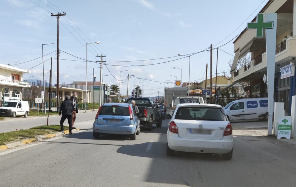 Συγκεκριμένα το μπλε αυτοκίνητο έπεσε πάνω στο μαύρο, με αποτέλεσμα να δημιουργηθεί προς στιγμήν κυκλοφοριακή δυσχέρεια στο σημείο.