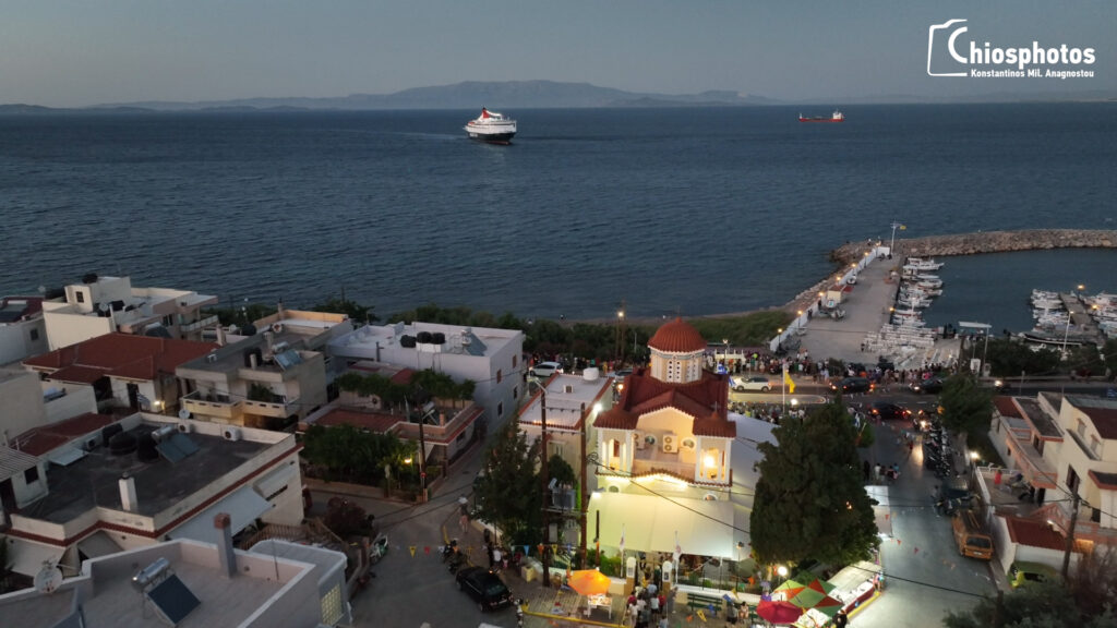 Ο Χιώτης καπετάνιος Γιώργος Αρβανίτης έφερε το πλοίο Νήσος Σάμος μία ανάσα από το λιμανάκι και απέδωσε τιμές εν μέσω συριγμών, καμπανοκρουσιών και πλήθος βεγγαλικών.