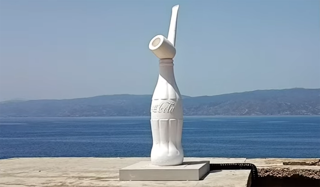 Είναι από τις στιγμές που μένεις με το στόμα ανοιχτό. Περπατάς στην Ύδρα, από τον όρμο του Μανδρακίου με κατεύθυνση προς την Χώρα της Ύδρας και ενώ ατενίζεις το απέραντο γαλάζιο του Αιγαίου, ξαφνικά βλέπεις μια παράξενη δημιουργία. Ένα διάσημο αναψυκτικό που στο πάνω μέρος του έχει μια πίπα. Και αυτό, σε ένα από τα πιο διάσημα νησιά του jet- set, στην Ύδρα, και μάλιστα στην οροφή των πρώην σφαγείων του νησιού.