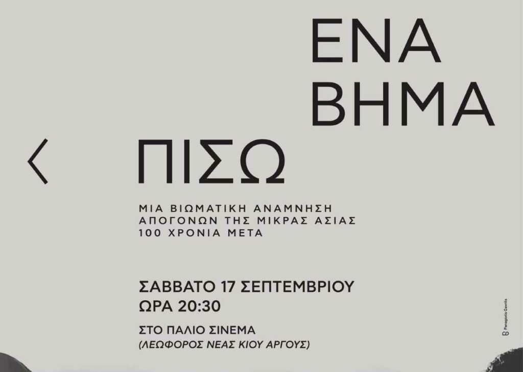 Πρεμιέρα για το ντοκιμαντέρ μικρού μήκους «Ένα Βήμα Πίσω» και της μουσικοθεατρικής εγκατάστασης «Ένα Βήμα Πίσω-Εγκατάσταση στο παλιό σινεμά»(Σινέ Πλαζ) το Σάββατο 17 Σεπτεμβρίου και ώρα 8.30 μμ στο παλιό σινεμά (πρώην Μεταξουργείο Δελή και αργότερα «ΣΙΝΕ ΠΛΑΖ») στη Νέα Κίο Αργολίδας. Παρουσιάζονται στο πλαίσιο των εκδηλώσεων με αφορμή την επέτειο των 100 χρόνων της Μικρασιατικής Καταστροφής από την Επιτροπή Μνήμης Νέας Κίου Δήμου Άργους-Μυκηνών.