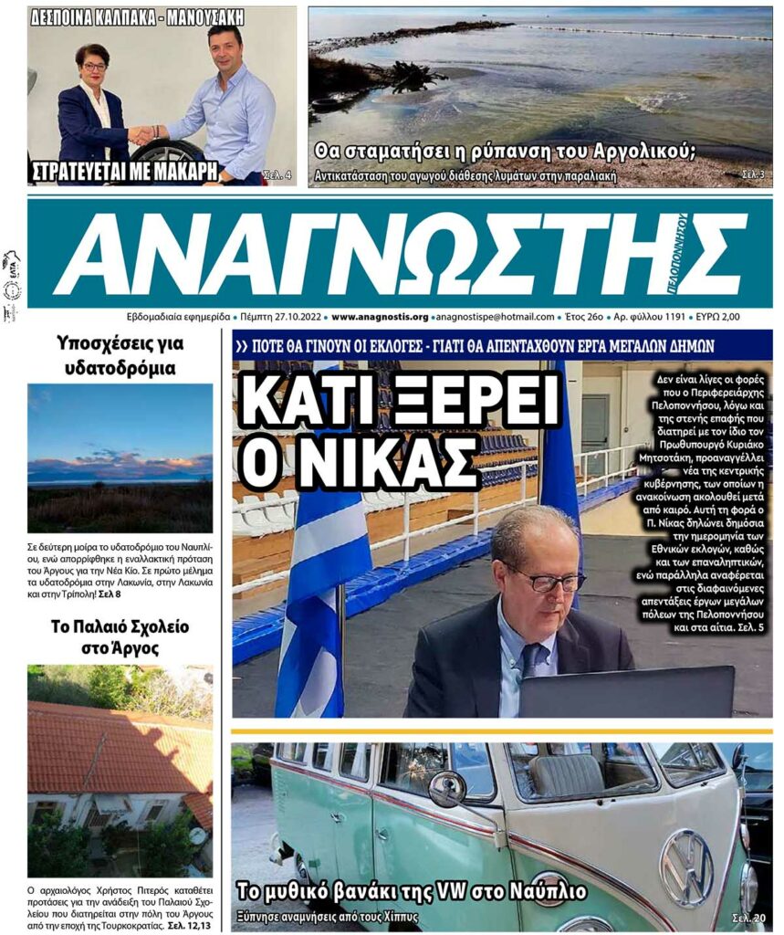 To Τεύχος 1191 της εβδομαδιαίας εφημερίδας Αναγνώστης Πελοποννήσου με έδρα το Ναύπλιο του Νομού Αργολίδας που εκδόθηκε και κυκλοφόρησε την Πέμπτη 27 Οκτωβρίου 2022