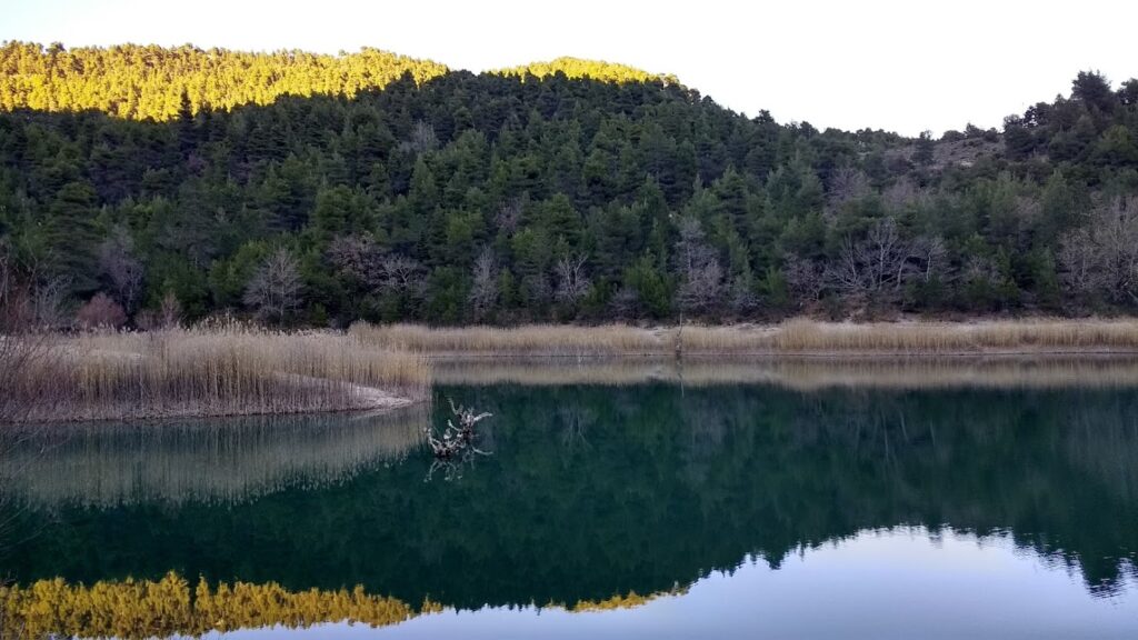 Γύρω από τη λίμνη απλώνεται το πυκνό πευκοδάσος της μαύρης πεύκης και λίγο ψηλότερα ξεπροβάλλουν τα έλατα.