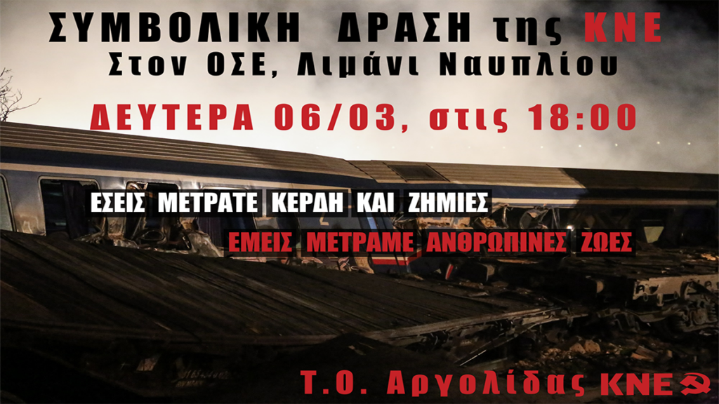 Η ΤΟ Αργολίδας της ΚΝΕ με σύνθημα «ΕΣΕΊΣ ΜΕΤΡΆΤΕ ΚΈΡΔΗ ΚΑΙ ΖΗΜΙΈΣ, ΕΜΕΊΣ ΜΕΤΡΆΜΕ ΑΝΘΡΏΠΙΝΕΣ ΖΩΈΣ» πραγματοποιεί αύριο Δευτέρα 6 Μαρτίου συμβολική δράση.