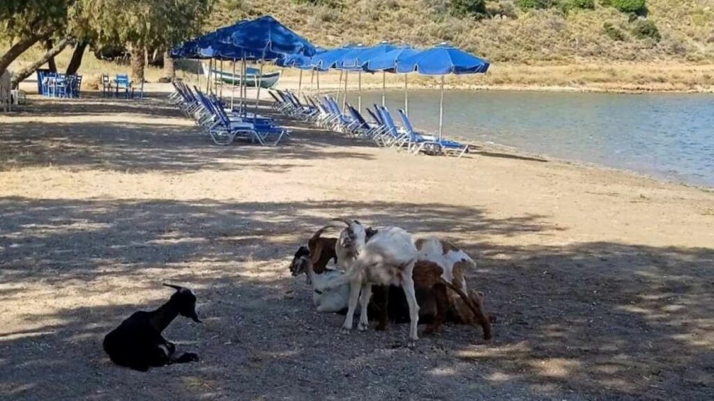 Κατσίκια που χαλάρωναν και απολάμβαναν τον ήλιο και τη θάλασσα τις πρωινές ώρες, πριν η παραλία γεμίσει με κόσμο. Αυτή η ανεπανάληπτη εμπειρία έδωσε στους λουόμενους την ευκαιρία να απολαύσουν ένα ήσυχο και φυσικό σκηνικό, που σπάνια συναντάμε σε παραθαλάσσιες περιοχές.