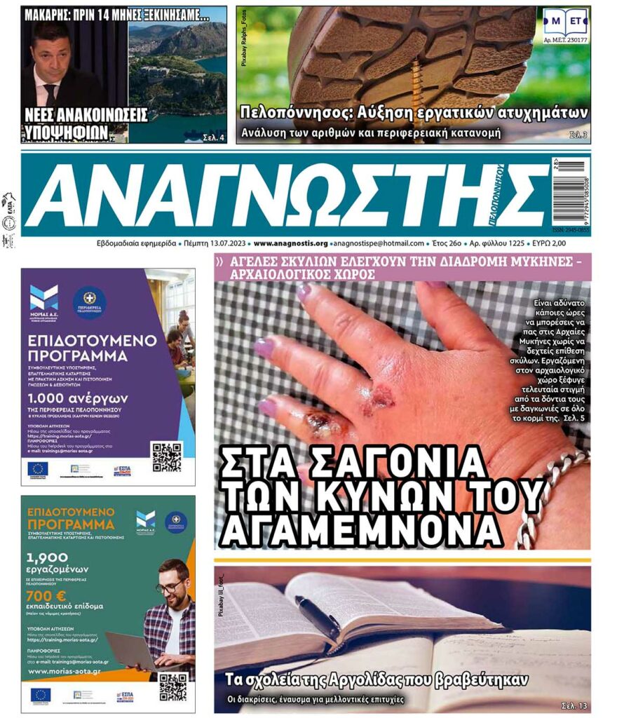 To Τεύχος 1225 της εβδομαδιαίας εφημερίδας Αναγνώστης Πελοποννήσου με έδρα το Ναύπλιο του Νομού Αργολίδας που εκδόθηκε και κυκλοφόρησε την Πέμπτη 13 Ιουλίου 2023