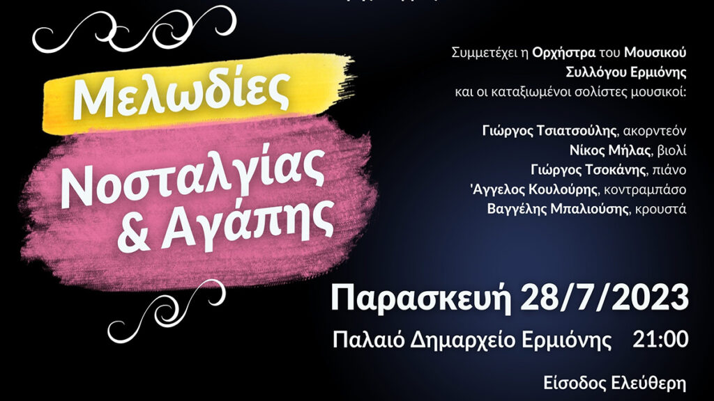 Μετά τη καθομολογουμένη σαρωτική επιτυχία της περσινής καλοκαιρινής εμφάνισης, ο Μουσικός Σύλλογος Ερμιόνης επιστρέφει δυναμικά παρουσιάζοντας αγαπημένα κανταδόρικα ελληνικά τραγούδια bel canto συμπράττοντας επί σκηνής με τους αδελφούς, Σπύρο & Μάκη Καραβιώτη την Παρασκευή 28 Ιουλίου και ώρα 21:00 στον προαύλιο χώρο του Παλαιού Δημαρχείου Ερμιόνης.
