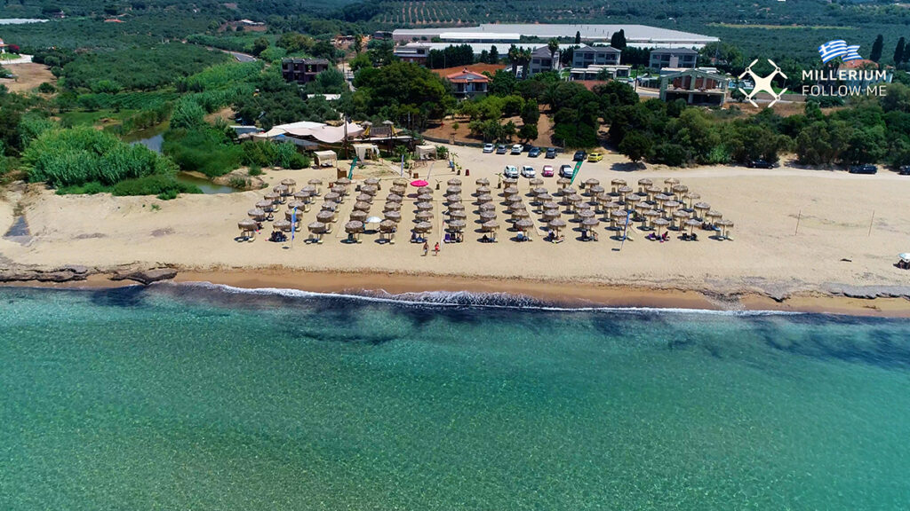 Η «χρυσή» αμμώδης παραλία εκτείνεται σε μήκος 2 χιλιομέτρων και δεξιά και αριστερά περικλείεται από βράχια. Μάλιστα, τα καταγάλανα νερά της προσδίδουν στο τοπίο μία εξωτική ομορφιά. Κατά τους καλοκαιρινούς μήνες στην παραλία λειτουργεί καντίνα με ομπρέλες και ξαπλώστρες.
