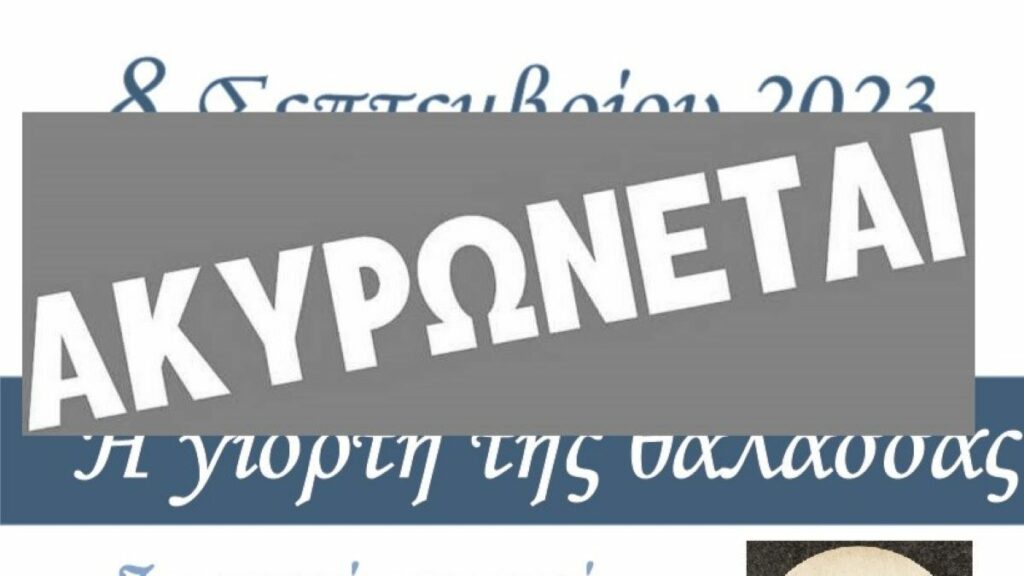 Η ΚΕΔΑΜ ενημερώνει πως η Γιορτή της Θάλασσας που ήταν προγραμματισμένη να γίνει στις 8 Σεπτεμβρίου 2023 και ώρα 9μμ στην παραλία της Νέας Κίου ακυρώνεται.