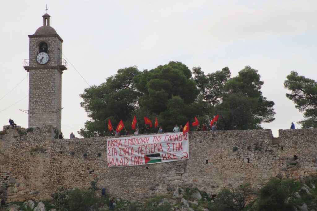 «ΚΑΜΙΑ ΕΜΠΛΟΚΗ ΤΗΣ ΕΛΛΑΔΑΣ ΣΤΗ ΣΦΑΓΗ-ΛΕΥΤΕΡΙΑ ΣΤΗ ΠΑΛΑΙΣΤΙΝΗ», τονίζει το σχετικό πανό που αναρτήθηκε από τα μέλη του ΚΚΕ.