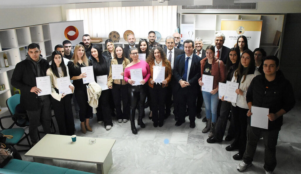 Με επιτυχία πραγματοποίησε το Επιμελητήριο Αργολίδας σε συνεργασία με την Ομοσπονδία Επαγγελματιών Βιοτεχνών και Εμπόρων Άργους, την Κυριακή 26 Νοεμβρίου, εκδήλωση απονομής επαίνων και χρηματικών βραβείων στους πρωτεύσαντες αποφοίτους των Τεχνικών και Επαγγελματικών Σχολών του Ν. Αργολίδας, στην αίθουσα συνεδριάσεων του, στο Άργος.