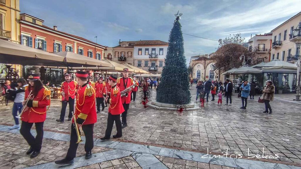 Στο κέντρο της πόλης βγήκε και η φιλαρμονική του Δήμου Ναυπλιέων που παιάνισε στους δρόμους πρωτοχρονιάτικες μελωδίες και κάλαντα.
