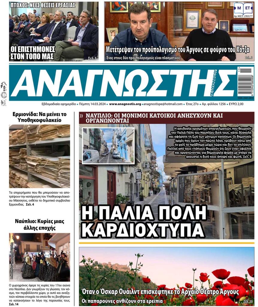 To Τεύχος 1256 της εβδομαδιαίας εφημερίδας Αναγνώστης Πελοποννήσου με έδρα το Ναύπλιο του Νομού Αργολίδας που εκδόθηκε και κυκλοφόρησε την Πέμπτη 14 Μαρτίου 2024