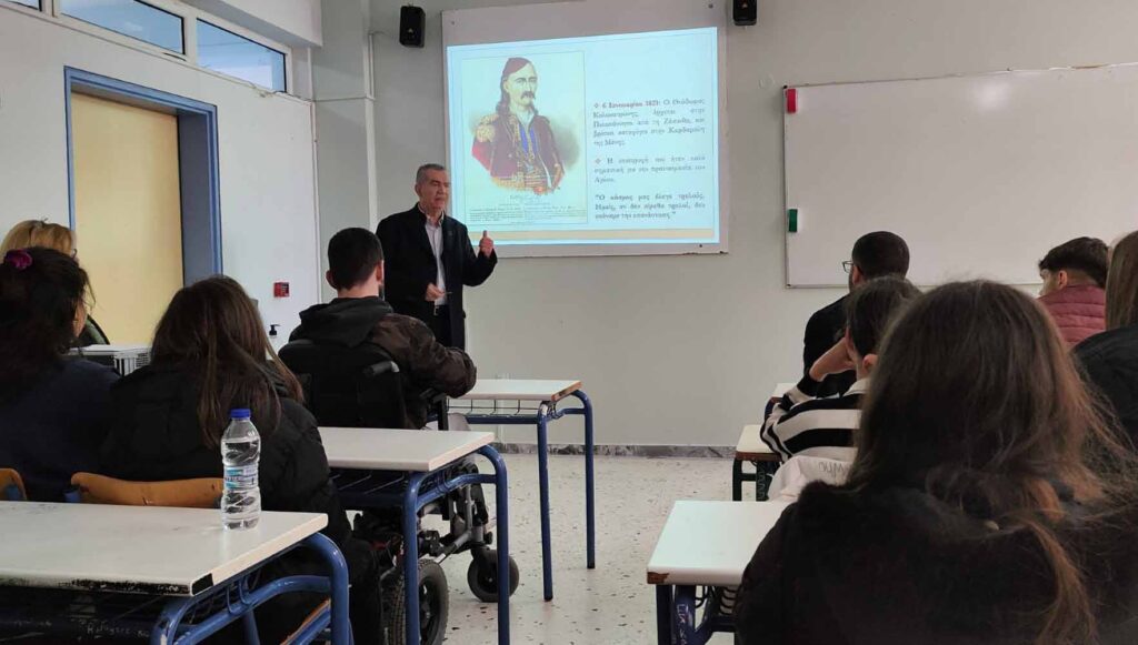 Οι μαθητές και οι μαθήτριες της κατεύθυνσης Ανθρωπιστικών Σπουδών του 3ου Γενικού Λυκείου Άργους, μαζί με τους φιλολόγους τους, υποδέχθηκαν τον γενικό γραμματέα της Αργολικής Αρχειακής Βιβλιοθήκης κ. Αναστάσιο Τσάγκο, με την εισήγηση και καθοδήγηση του οποίου, προσέγγισαν, σε ένα διαδραστικό πλαίσιο μάθησης, το θέμα: «Η έκρηξη της Ελληνικής Επανάστασης στο Άργος».