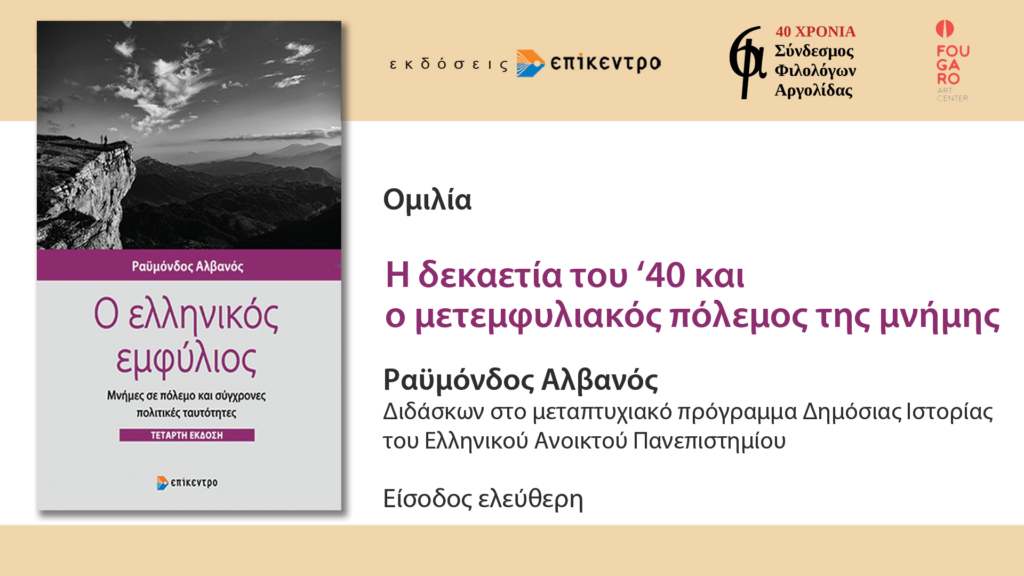 Ο Σύνδεσμος Φιλολόγων Αργολίδας, το FOUGARO ARTCENTER και οι εκδόσεις Επίκεντρο διοργανώνουν εκδήλωση με ομιλητή τον διδάσκοντα στο μεταπτυχιακό πρόγραμμα Δημόσιας Ιστορίας του Ελληνικού Ανοικτού Πανεπιστημίου Ραϋμόνδο Αλβανό, με τίτλο «Η δεκαετία του ’40 και ο μετεμφυλιακός πόλεμος της μνήμης».
