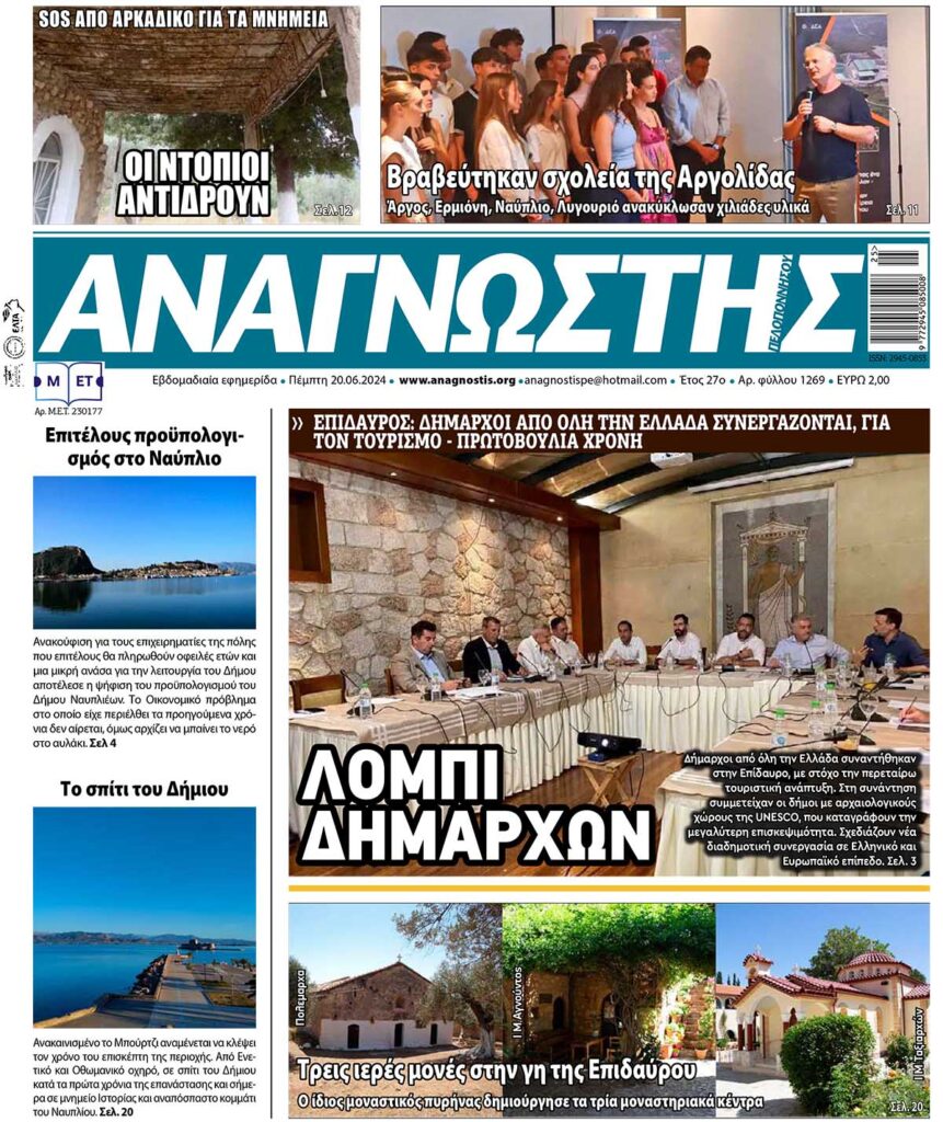 To Τεύχος 1269 της εβδομαδιαίας εφημερίδας Αναγνώστης Πελοποννήσου με έδρα το Ναύπλιο του Νομού Αργολίδας που εκδόθηκε και κυκλοφόρησε την Πέμπτη 20 Ιουνίου 2024