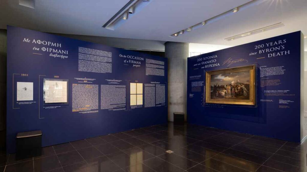 Η έκθεση «Ο Παρθενώνας και ο Βύρωνας», που πραγματοποιείται με την ευκαιρία των 200 χρόνων από τον θάνατο του λόρδου Βύρωνα στο φουαγιέ του ισογείου του Μουσείου (ελεύθερη είσοδος), ξεκίνησε τον Απρίλιο 2024 και θα διαρκέσει όλον τον χρόνο. Μια ξεχωριστή έκθεση (και μια εξαιρετική δίγλωσση έκδοση, ελληνικά και αγγλικά, που τη συνοδεύει) που παρουσιάζει, μεταξύ άλλων, το πρωτότυπο διαβατήριο του Βύρωνα, ένα αναπάντεχο πραγματικό επίσημο σουλτανικό έγγραφο που εκτίθεται για πρώτη φορά στο Μουσείο, με αφορμή το οποίο συζητείται εκ νέου η επιχειρηματολογία για την επιστροφή και επανένωση των γλυπτών του Παρθενώνα. Κι αυτό γιατί, σύμφωνα με τους διοργανωτές, φαίνεται καθαρά τι είναι σουλτανικό φιρμάνι και τι παρουσιάζεται στην επιστολή, που μεταφρασμένη στην ιταλική γλώσσα, θεώρησαν οι Βρετανοί το 1816 ότι μπορούσαν να αγοράσουν και να μεταβιβάσουν στο Βρετανικό Μουσείο, τα γλυπτά της λεηλασίας του Έλγιν, όταν εκείνος χρεοκόπησε.