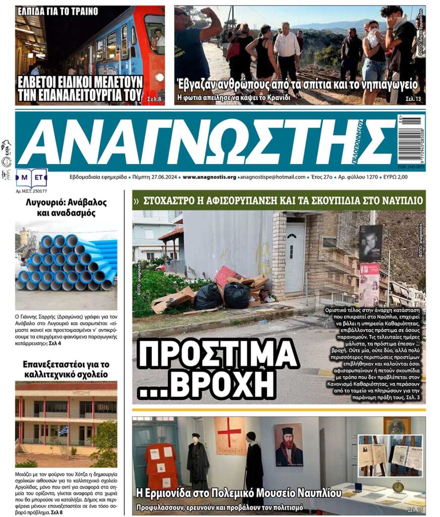 To Τεύχος 1270 της εβδομαδιαίας εφημερίδας Αναγνώστης Πελοποννήσου με έδρα το Ναύπλιο του Νομού Αργολίδας που εκδόθηκε και κυκλοφόρησε την Πέμπτη 27 Ιουνίου 2024