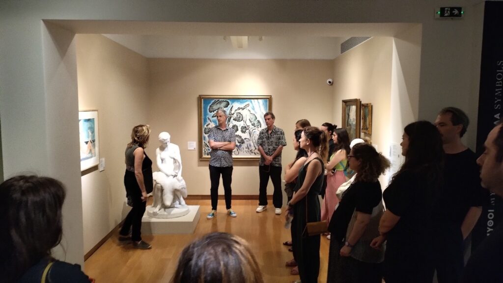 Η ξενάγηση στις συλλογές της Πινακοθήκης έγινε με μεγάλο ενδιαφέρον και δεν ήταν λίγοι εκείνοι που εκδήλωσαν το θαυμασμό τους για τα εκθέματα της μόνιμης έκθεσης με τις ελληνικές φορεσιές και τα θέματα της Ελληνικής Επανάστασης. Ο αίθριος χώρος της Πινακοθήκης, γνωστός στους διοργανωτές για την χαρούμενα φιλόξενη επίσης βραδιά του καλωσορίσματος των προηγούμενων χρόνων, έμελλε να γνωρίσει μια καλλιτεχνική παρουσία που χάρισε στους παρευρισκόμενους την μυσταγωγία της αρχαιοελληνικής ύπαρξης και τον αρχέγονο μυστικισμό του ασιατικού πνεύματος σε μια σύνθεση της Kimvi Nguyen, μια εξαιρετική βιετναμο-βρετανίδα καλλιτέχνιδα με πανεπιστημιακές συνεργασίες στην Κίνα και σε πολλά άλλα μέρη του κόσμου. Η επιτέληση που πραγματοποίησε στον αίθριο χώρο της Πινακοθήκης ήταν απρόσμενη, συγκινητική, βαθιά ανθρώπινη και ποιητική, αλλά ταυτόχρονα αντάξια του χώρου της Πινακοθήκης, του πιο φιλόξενου χώρου τέχνης της πόλης του Ναυπλίου.