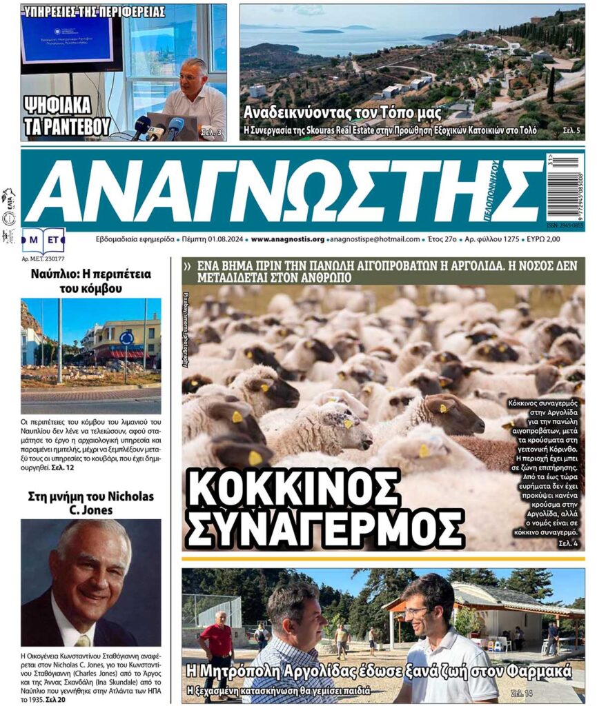 To Τεύχος 1275 της εβδομαδιαίας εφημερίδας Αναγνώστης Πελοποννήσου με έδρα το Ναύπλιο του Νομού Αργολίδας που εκδόθηκε και κυκλοφόρησε την Πέμπτη 01 Αυγούστου 2024