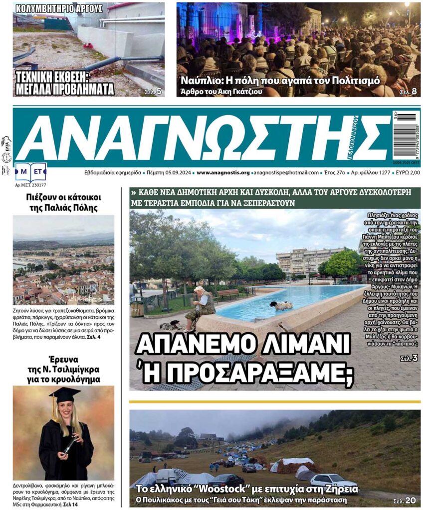To Τεύχος 1277 της εβδομαδιαίας εφημερίδας Αναγνώστης Πελοποννήσου με έδρα το Ναύπλιο του Νομού Αργολίδας που εκδόθηκε και κυκλοφόρησε την Πέμπτη 05 Σεπτεμβρίου 2024