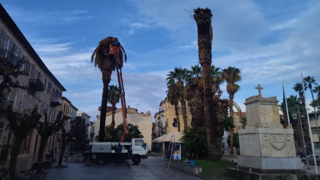 Ξεκίνησαν οι εργασίες απομάκρυνσης φοινίκων μπροστά από το Δημαρχείο Ναυπλίου, καθώς τα δέντρα είχαν προσβληθεί από το καταστροφικό κόκκινο σκαθάρι. Ήδη απομακρύνθηκαν οι δύο μικροί φοίνικες, ενώ αύριο προγραμματίζεται η αφαίρεση και των δύο μεγαλύτερων.