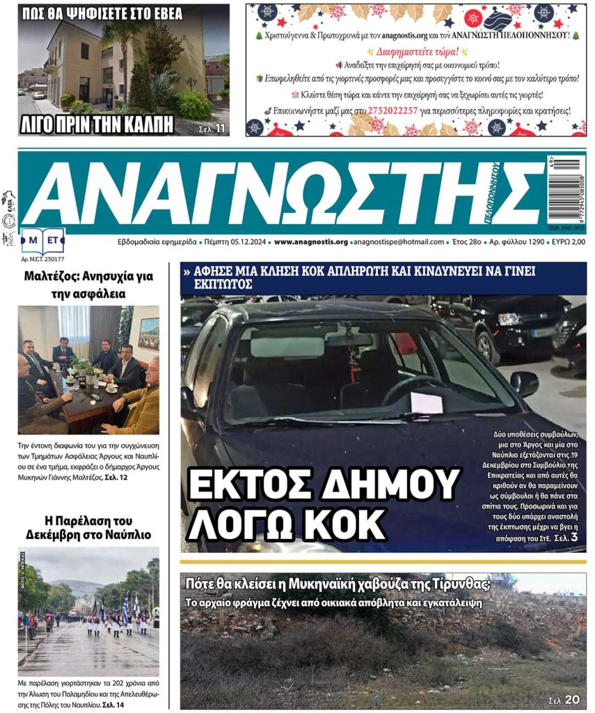 To Τεύχος 1290 της εβδομαδιαίας εφημερίδας Αναγνώστης Πελοποννήσου με έδρα το Ναύπλιο του Νομού Αργολίδας που εκδόθηκε και κυκλοφόρησε την Πέμπτη 05 Δεκεμβρίου 2024