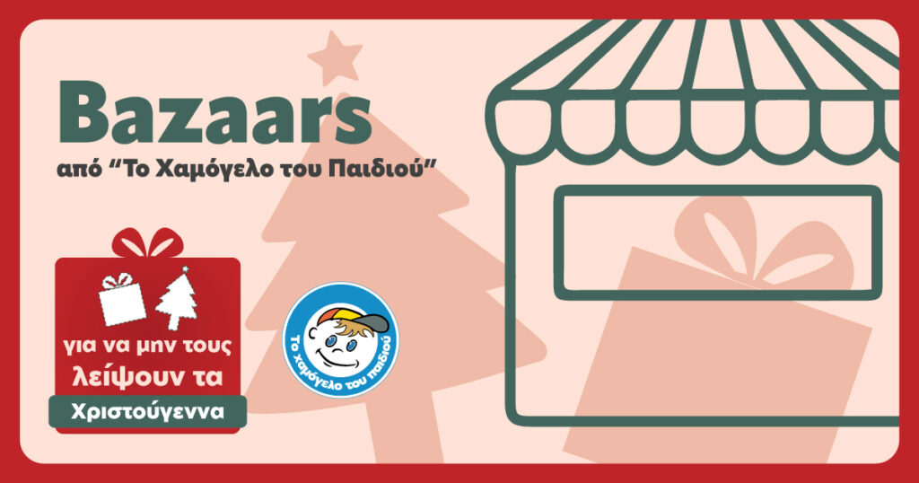 Για να μη λείψουν τα Χριστούγεννα σε κανένα παιδί… «Το Χαμόγελο του Παιδιού» σας προσκαλεί και φέτος στα Χριστουγεννιάτικα Bazaars που διοργανώνει ανά την Ελλάδα, ώστε να υποστηρίξουμε τα παιδιά που φιλοξενούνται στα Σπίτια του Οργανισμού πανελλαδικά, τα παιδιά που υποστηρίζονται στα Σπίτια Ημερήσιας Φροντίδας του Οργανισμού και τα παιδιά, που οι οικογένειές τους αντιμετωπίζουν προβλήματα διαβίωσης και αδυνατούν να καλύψουν ακόμα και τις βασικότερες ανάγκες των παιδιών τους (υλικές, ιατρικές, εκπαιδευτικές κ.λπ.).