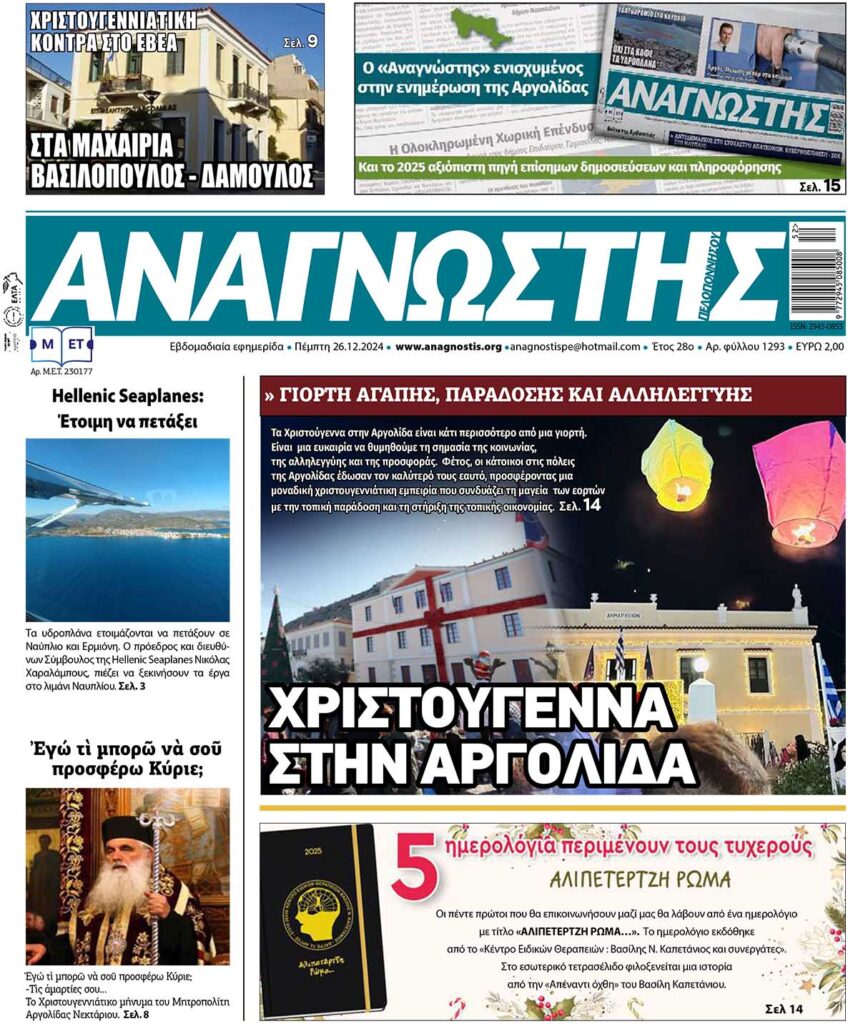 To Τεύχος 1293 της εβδομαδιαίας εφημερίδας Αναγνώστης Πελοποννήσου με έδρα το Ναύπλιο του Νομού Αργολίδας που εκδόθηκε και κυκλοφόρησε την Πέμπτη 26 Δεκεμβρίου 2024