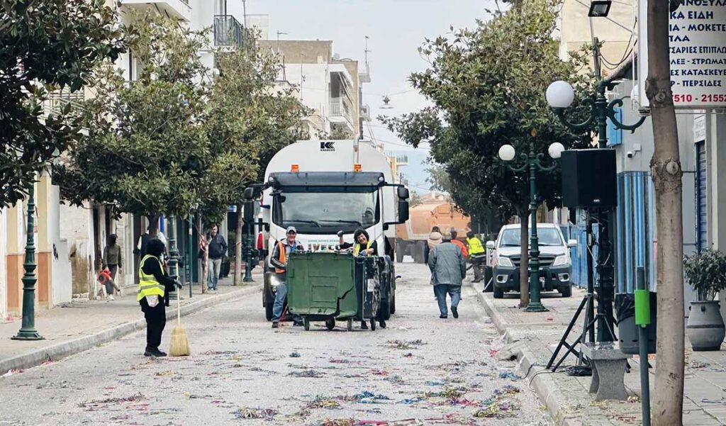 Το πρωί της Τρίτης, συνεργεία καθαρισμού έπιασαν δουλειά στη Βασιλίσσης Σοφίας, έναν από τους κεντρικούς δρόμους της πόλης, όπου είχε περάσει η καρναβαλική παρέλαση. Σκουπίδια, χαρτοπόλεμος και σερπαντίνες κάλυπταν το οδόστρωμα, όμως οι εργάτες με σκούπες, απορριμματοφόρα και ειδικό εξοπλισμό αποκατέστησαν γρήγορα την καθαριότητα.