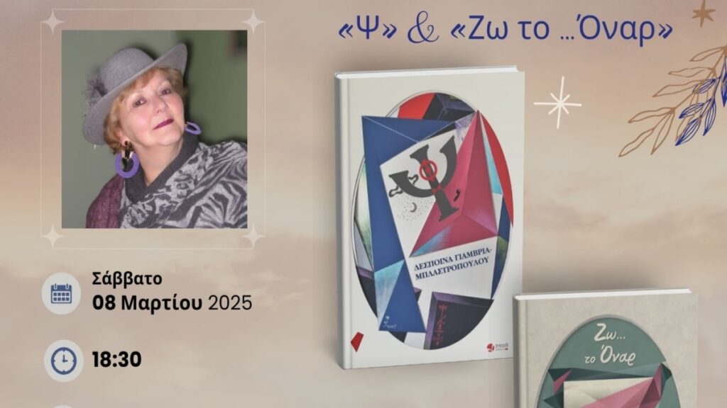 Το Σάββατο 8 Μαρτίου 2025 και ώρα 18:30 ο Προοδευτικός Σύλλογος Ναυπλίου «Ο Παλαμήδης», η Ένωση Συγγραφέων & Λογοτεχνών Αργολίδας και οι εκδόσεις Πνοή σας προσκαλούν στην παρουσίαση των βιβλίων της Δέσποινας Γιαμβριά-Μπλαστροπούλου «Ψ» & «Ζω το …Όναρ» στον χώρο του Προοδευτικού Συλλόγου Ναυπλίου «Ο Παλαμήδης», Σταϊκοπούλου 52, στο Ναύπλιο.