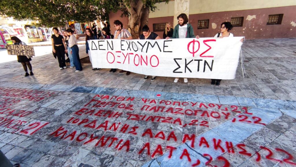Κρατώντας πανό που έγραφε «Δεν έχω οξυγόνο», φοιτητές της Σχολής Καλών Τεχνών Ναυπλίου φώναξαν δυνατά τα ονόματα των αδικοχαμένων θυμάτων των Τεμπών και τα έγραψαν στο έδαφος με σπρέι, θέλοντας να κρατήσουν ζωντανή τη μνήμη τους και να ζητήσουν δικαιοσύνη.