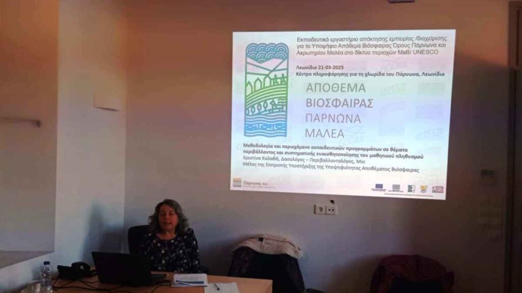 Με επιτυχία πραγματοποιήθηκε στο Λεωνίδιο, την Παρασκευή 21 Μαρτίου, Παγκόσμια Ημέρα Δασοπονίας, το εκπαιδευτικό εργαστήριο απόκτησης εμπειρίας και διαχείρισης για το Υποψήφιο Απόθεμα Βιόσφαιρας Όρους Πάρνωνα και Ακρωτηρίου Μαλέα, στο πλαίσιο
