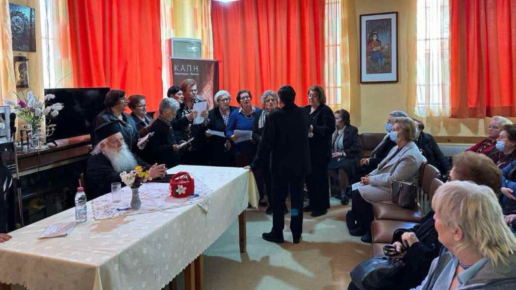 Στη συνέχεια, η χορωδία του Κ.Α.Π.Η. απέδωσε ύμνους της Μεγάλης Εβδομάδας, ενώ η Γαρυφαλλιά Μούκα συγκίνησε τους παρευρισκόμενους με την απαγγελία του «Μοιρολογιού της Παναγίας».