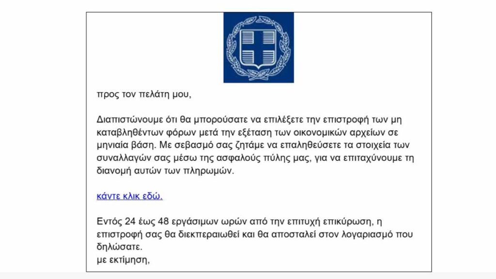 Αναγνώστες από διάφορες περιοχές της Πελοποννήσου –και όχι μόνο– αναφέρουν ότι έλαβαν email που φέρει το επίσημο λογότυπο του ελληνικού κράτους και έχει ως θέμα: «Αναμονή επιστροφής φόρου». Το μήνυμα παρουσιάζεται ως επίσημη ειδοποίηση και ζητά από τον παραλήπτη να επιβεβαιώσει τα οικονομικά του στοιχεία μέσω «ασφαλούς πύλης».