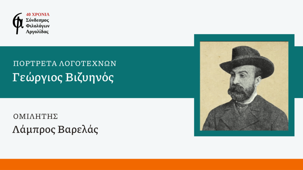 Ο Σύνδεσμος Φιλολόγων Αργολίδας διοργανώνει σειρά διαδικτυακών διαλέξεων με τον γενικό τίτλο «Πορτρέτα Λογοτεχνών». Η επόμενη εκδήλωση είναι προγραμματισμένη για το Σάββατο 10 Μαΐου, στις 7 το απόγευμα. Το πορτραίτο του Γεώργιου Βιζυηνού θα σκιαγραφήσει ο Λάμπρος Βαρελάς, Καθηγητής Νεοελληνικής Φιλολογίας στο Τμήμα Φιλολογίας του Αριστοτελείου Πανεπιστημίου Θεσσαλονίκης.
