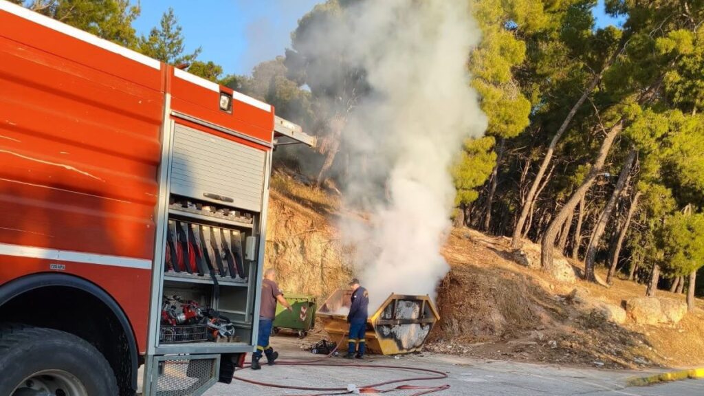 Συναγερμός σήμανε το πρωί της Τετάρτης 4 Ιουνίου, στην είσοδο της Ερμιόνης, όταν ξέσπασε φωτιά σε μεταλλικό κάδο ογκωδών απορριμμάτων, λίγα μόλις μέτρα από γειτονικό δασάκι.