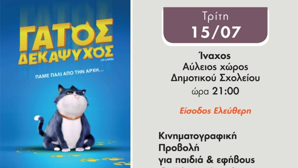 Η κινηματογραφική προβολή της ταινίας “Γάτος Δεκάψυχος” θα πραγματοποιηθεί απόψε, Τρίτη 15 Ιουλίου και ώρα 21:00, στον Αύλειο χώρο του Δημοτικού Σχολείου Ινάχου.
