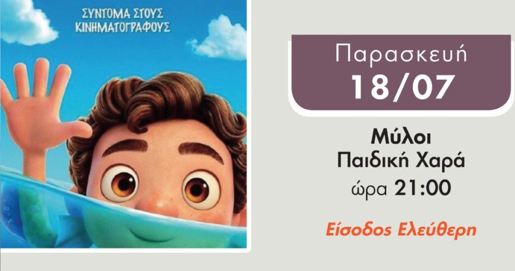 Σήμερα Παρασκευή 18 Ιουλίου, στις 9μμ, στην παιδική χαρά των Μύλων, θα πραγματοποιηθεί η κινηματογραφική προβολή για παιδιά της ταινίας «Λούκα».