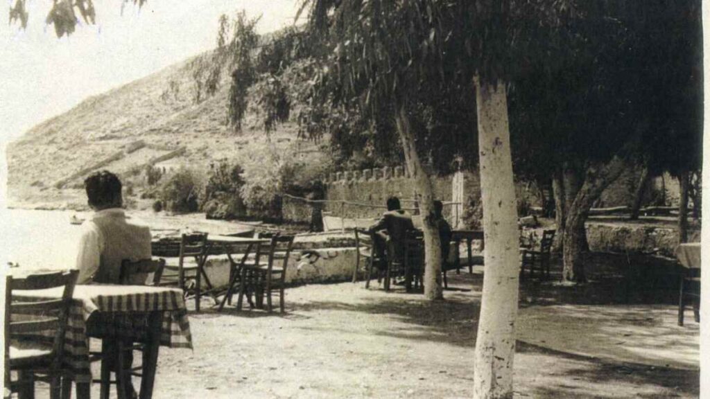 Καφενείο στην παραλία Κιβερίου. Εκεί όπου σήμερα είναι το Summer Club. Αρχείο Λιλή Καρύμπακα. (Τα τείχη πίσω). Η μεσαιωνική έπαυλη στο Κιβέρι.