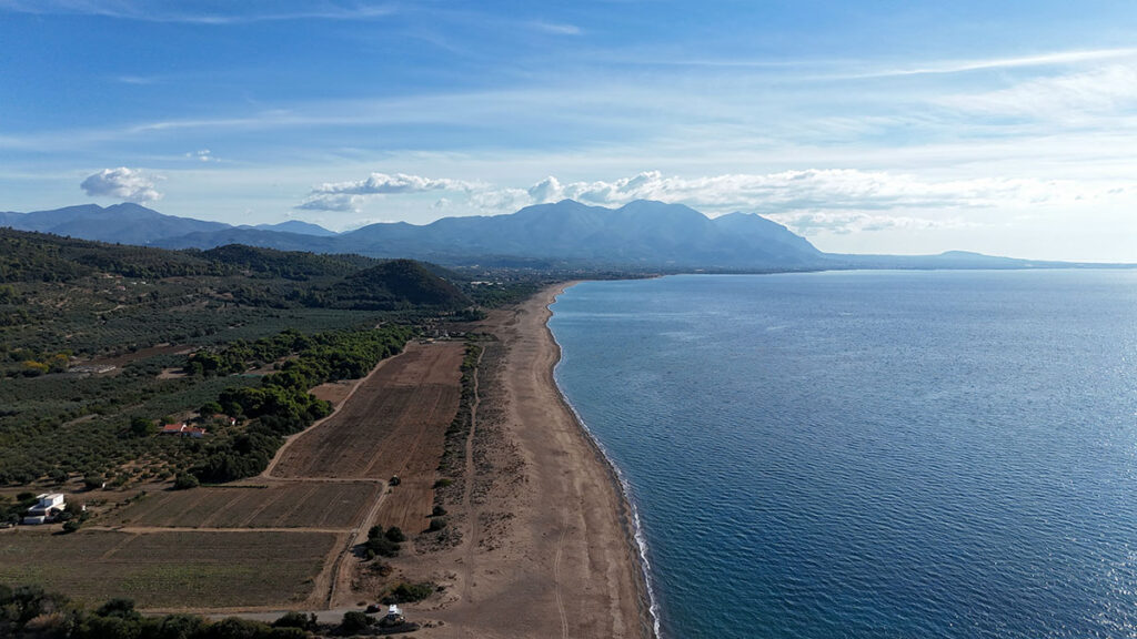 Η αχανής αμμουδιά με τη χοντρή άμμο, που έχει μήκος 55 χλμ. και ξεκινά βόρεια του Καλού Νερού Μεσσηνίας για να φτάσει μέχρι το Κατάκολο Ηλείας βρίσκει την καλύτερη έκφρασή της εδώ. Χωρίς καμία ξαπλώστρα, παρθένα και προστατευόμενη από το δίκτυο Natura, φιλοξενεί τις χελώνες Caretta Caretta, τα χνάρια των οποίων βλέπεις πάνω στην άμμο, αφού φτάνουν εδώ για να γεννήσουν τα αυγά τους.