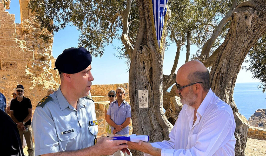 Εν συνεχεία, έγιναν τα αποκαλυπτήρια της επετειακής ετικέτας σήμανσης από τον Αντιδήμαρχο Μονεμβασίας κ. Σταύρο Χριστάκο, τον ερευνητή κ. Παναγιώτη Λαλούση, τον εκπρόσωπο του Ινστιτούτου Πολιτισμού Μεσσηνίας κ. Δημοσθένη Κορδό, τον διοικητή του Κέντρου Εκπαίδευσης Εφοδιασμού Μεταφορών (ΚΕΕΜ) Σπάρτης Ταξίαρχο κ. Γεώργιο Ζορμπά, τον διοικητή του Λιμενικού Σταθμού Μονεμβασίας κ. Ιωάννη Κωστάκο, τον διοικητή του Αστυνομικού Σταθμού Μονεμβασίας κ Νεκτάριο Γάγκα και τον πρωτοπρεσβύτερο π. Γεώργιο Κάμπρα. Ακολούθως, σε μια ιδιαίτερα συμβολική κίνηση, η ελληνική σημαία αποκαλυπτηρίων παρεδόθη από τον ερευνητή κ. Π. Λαλούση στον Ταξίαρχο του ΚΕΕΜ κ. Γ. Ζορμπά, ενώ η τελετή ολοκληρώθηκε με την απαγγελία του Εθνικού Ύμνου από τους παρευρισκόμενους. Επιπλέον, δίπλα στην μνημειακή ελιά τοποθετήθηκαν καλαίσθητες διακριτικές πινακίδες με την ιστορία του δέντρου και το λογότυπο του Δικτύου.