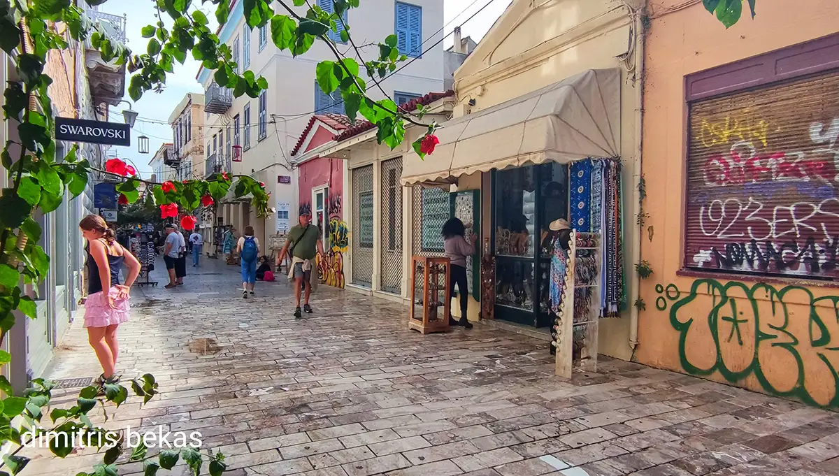 Οι φωτογραφίες του Δημήτρη Μπέκα αποτυπώνουν τη ζωντανή ατμόσφαιρα στην Πλατεία Συντάγματος και τον Μεγάλο Δρόμο, όπου επισκέπτες από διάφορες χώρες απολάμβαναν τον περίπατό τους, τα καφέ και τα καταστήματα αναμνηστικών.