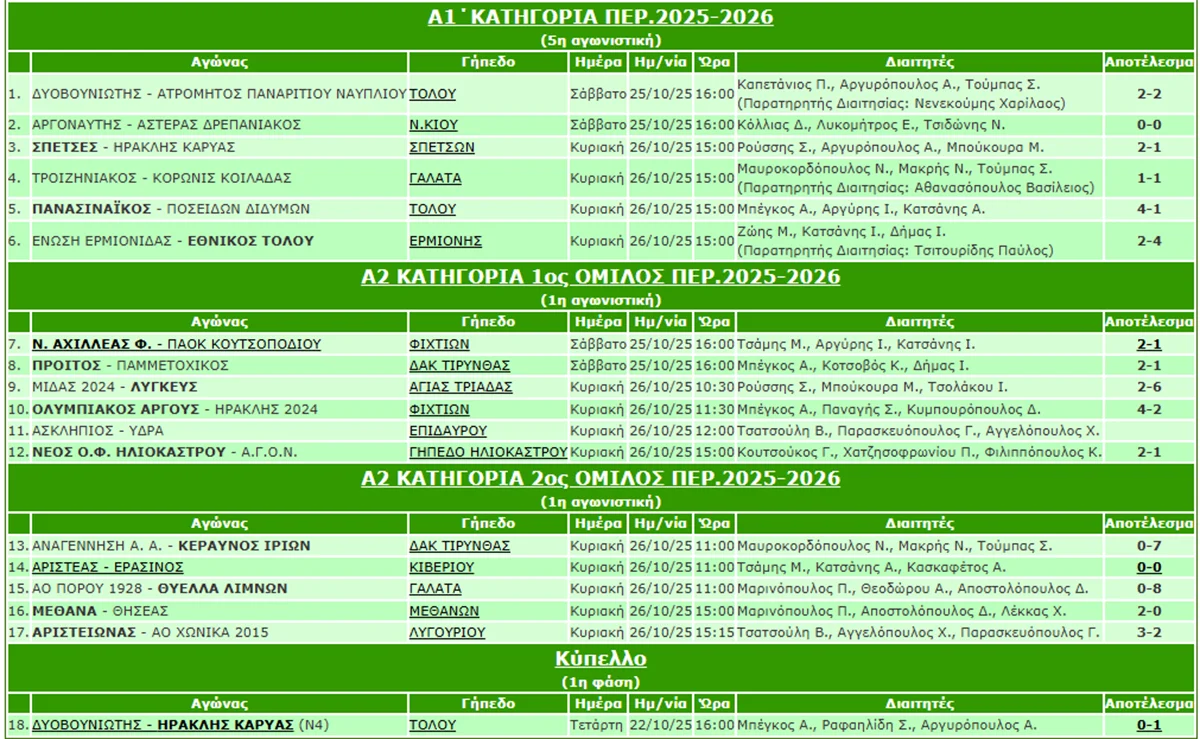 Συνεχίστηκαν με την 5η αγωνιστική της Α1 Κατηγορίας και την 1η της Α2 οι αγώνες των τοπικών πρωταθλημάτων της ΕΠΣ Αργολίδας. Τα ματς διεξήχθησαν το σαββατοκύριακο 25 και 26 Οκτωβρίου.